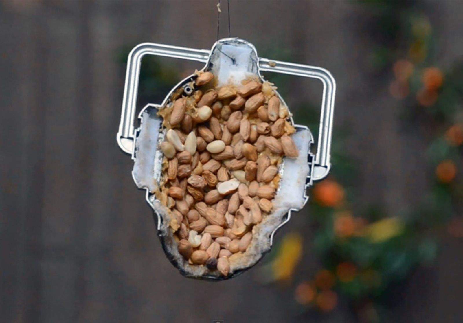 The Cyberman head used to be a shower radio and Young gutted it, loaded it with peanut butter and nuts and suspended it from a tree branch in her garden.