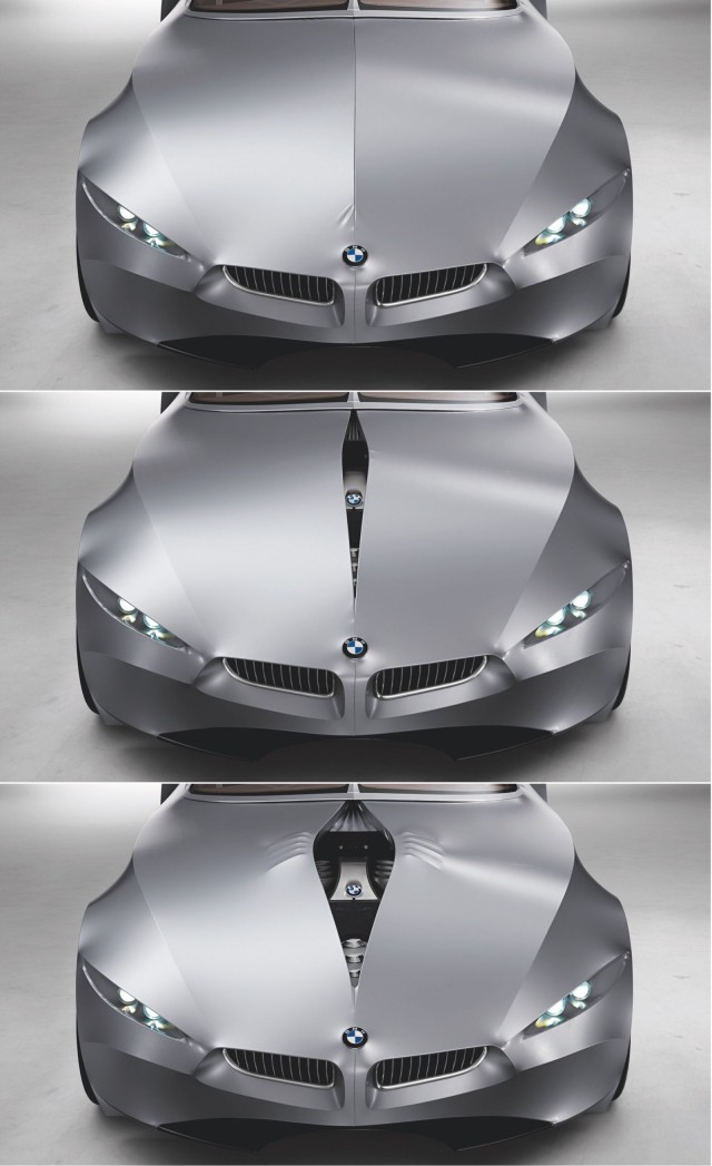 Under the fabric, tiny motors pull the skin back to change the car’s shape or reveal openings. It’s “eyelids,” for example, open to reveal the headlamps. The engine is accessed via a zipper-like opening on the hood. Here it is in action: