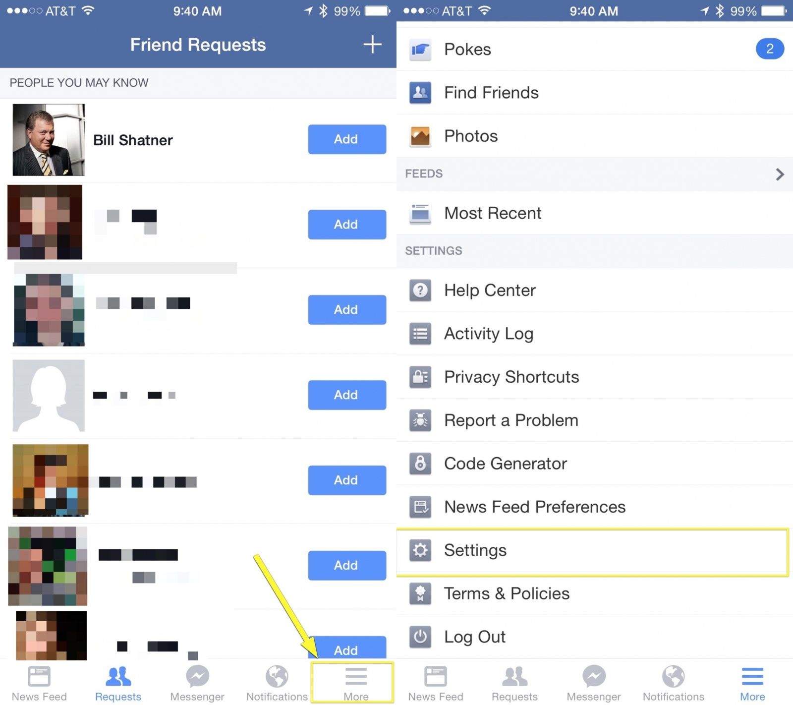 First, launch the Facebook app with a tap. Look to the bottom of the screen and tap on the More menu button to the far right – it looks like three horizontal lines stacked on top of each other.