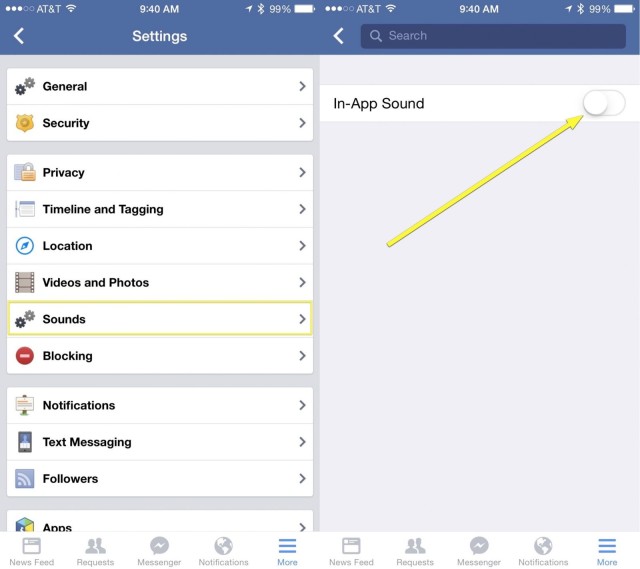 Next, swipe way down to the bottom of the resulting screen to find the Settings section. Tap there and then find the Sounds button. Tap it, and you’ll then see the In-App Sound toggle. Tap it to toggle the in-app sounds to OFF.