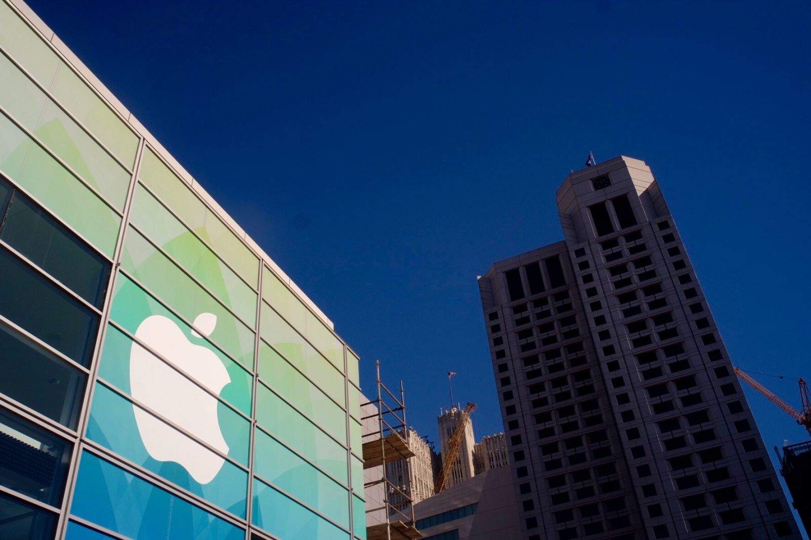 Apple’s crew began working on the event decorations this morning by adding a giant Apple logo graphic to front of Yerba Buena. It’s still a work in progress, but it looks like Apple is using the same graphic from the event invites that went out last week. Along with the Apple signage, a giant white tent has also been constructed nearby, presumably as a press hands-on area for after the event.