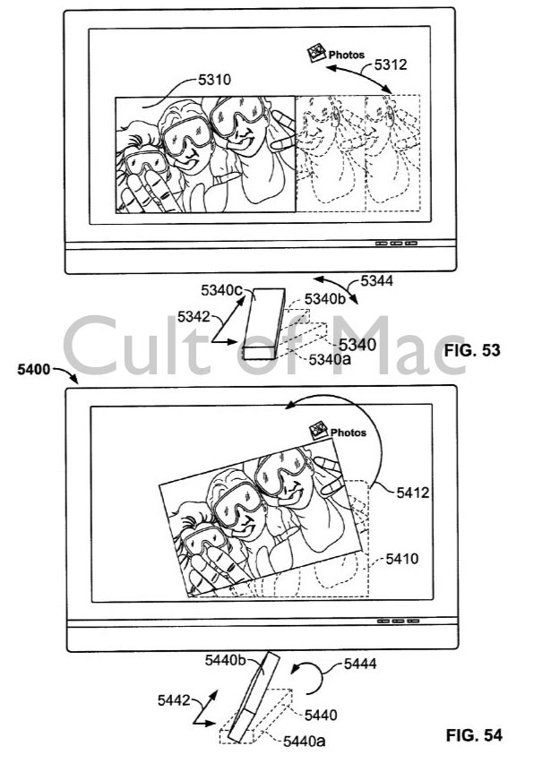 “The wand may include an optical component for capturing images of the infrared modules, and may calculate its orientation and distance from the modules based on the captured images,” the company writes in one patent. “In some embodiments, the electronic device may direct the infrared modules to identify the position of an infrared emitter incorporated on the wand, and may calculate the absolute position of the wand relative to the infrared modules.”