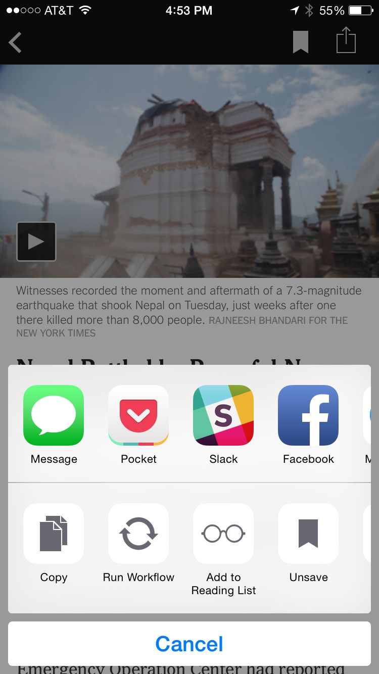 NYT Now integrates with iOS 8’s share menu, so you can send stories via apps like Messages and Slack or to another read later service like Pocket.