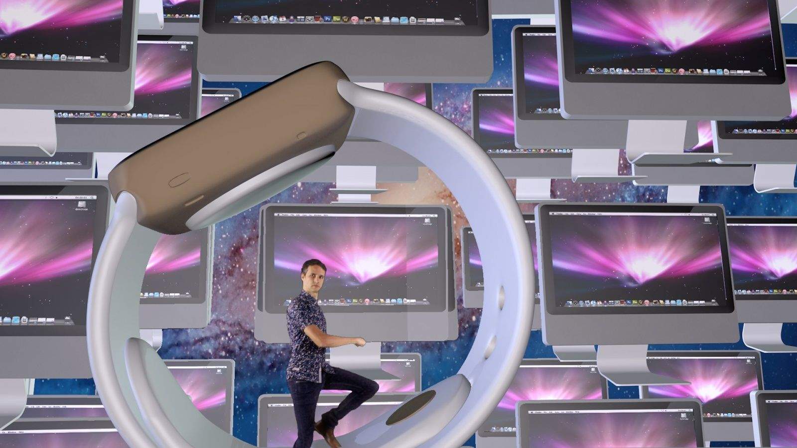 Like Jim Carrey on a nerdy bender, Davis croons and capers his way through a series of scenes that capture the urgent expectations of Apple Watch early adopters.