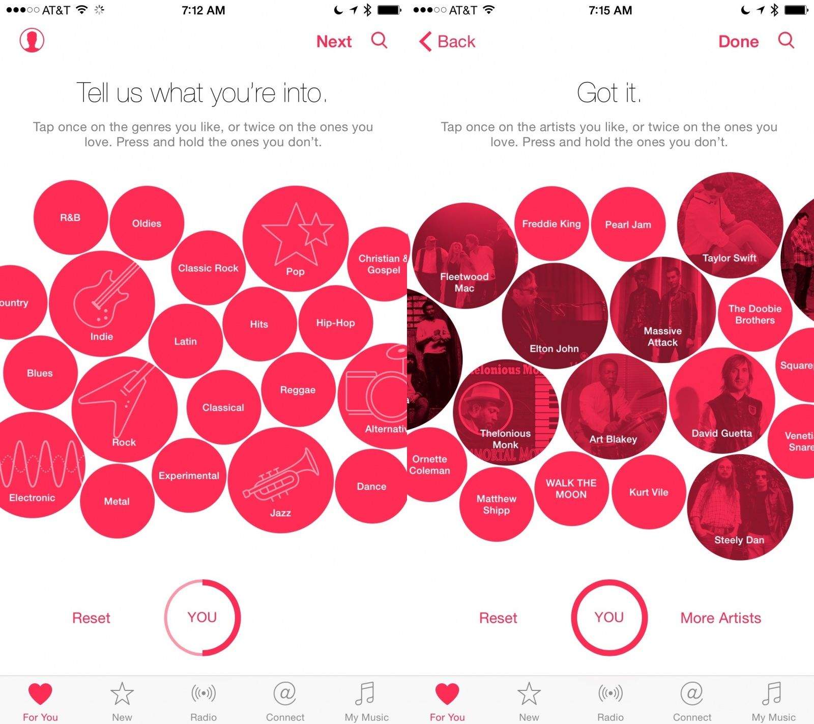 Getting signed up to Apple Music is a trivial affair, making it super easy to get past the business of connecting to the service and right into the music selection. The first think you’ll see after choosing a plan, family or single user, is a set of bubbles, each representing a genre like R&B, Rock, Experimental, or Jazz. Tap once for styles you like, twice for those you love, and tap and hold for the genres you can’t stand. It’s quick, intuitive, and super easy.