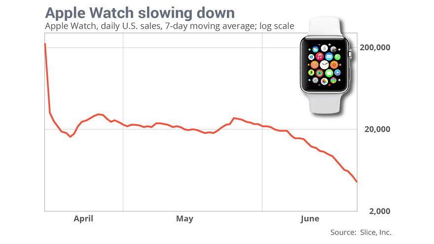 Apple kicked off launch week in April selling an average of 200,000 watches a day, however a new report from Slice Intelligence claims sales have dropped to fewer than 20,000 a day in the U.S., marking a 90% drop off since the week of April 10th.