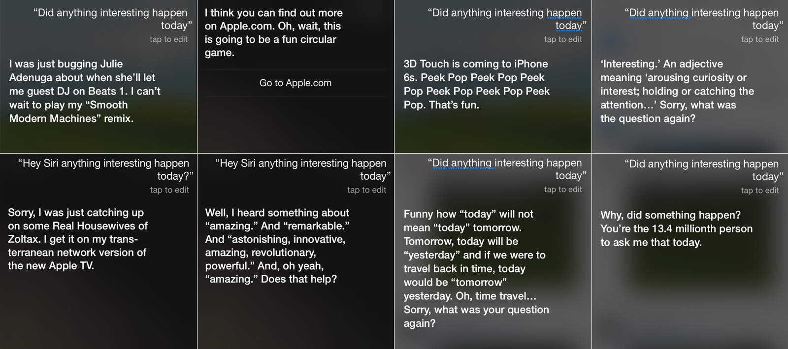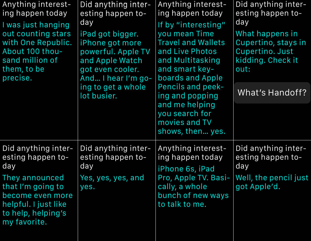 You can check out some of the responses we got from our iPhones below. Topics include the helper’s aspirations to spin some tracks on Apple’s Beats 1 radio station, 3D Touch, and musings on time travel. We assume that that last bit is a reference to the same-named feature coming to watchOS 2 next week, which lets you spin the Digital Crown to check future appointments and events.