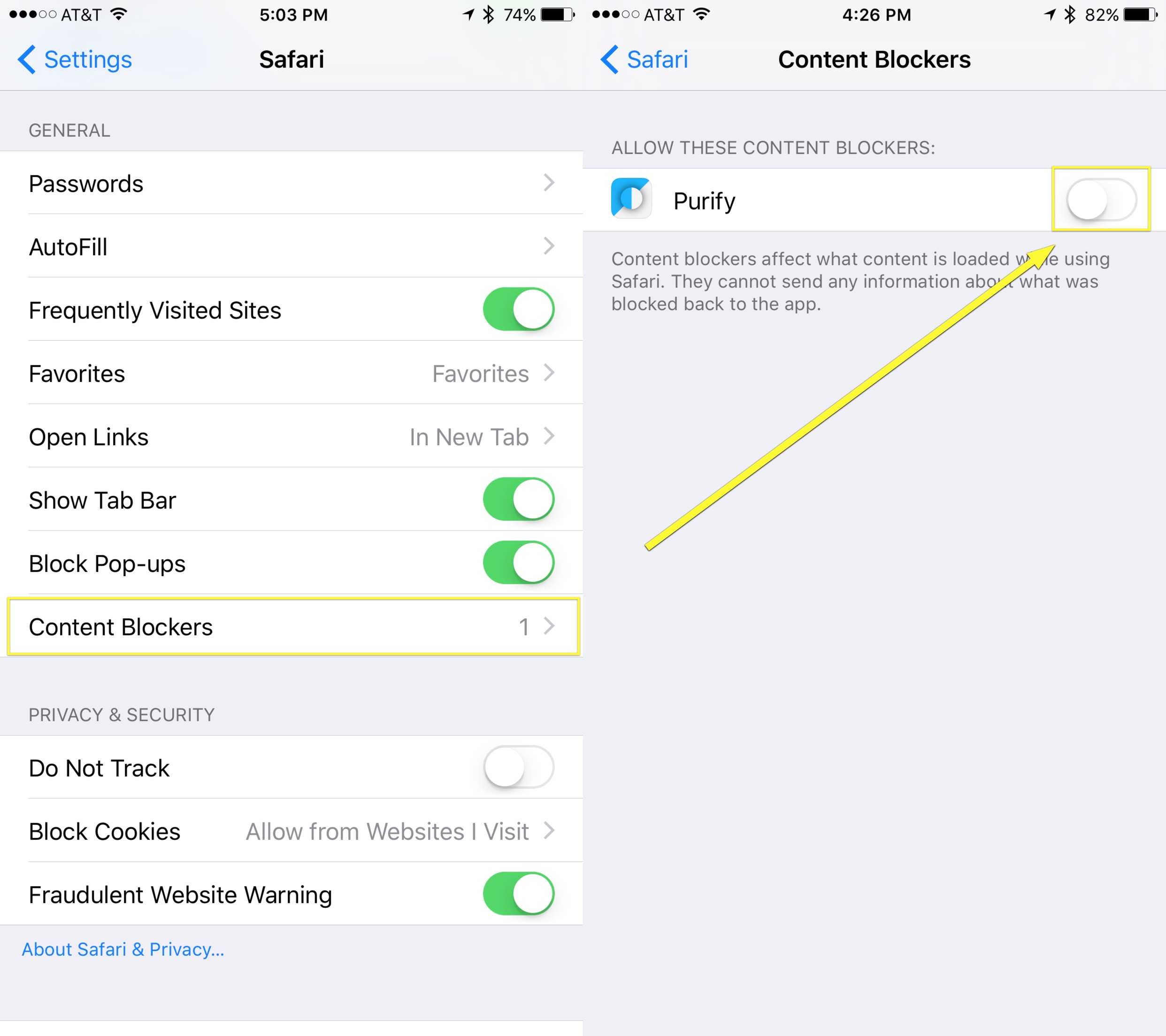 Tap on the Content Blockers area to see a list of all the ad-suppressing apps you’ve installed. Simply toggle the specific app you’d like to enable to ON, and tap out of Settings.