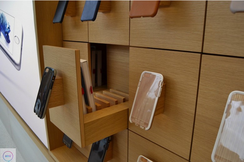 The Brussel’s store, which was open to the tech press for tours Thursday, appears to have fewer backlit product photos on the walls. The generous use of wood — from the benches at the Genius Bar to the drawers where products are stored — gives the showroom a warmer feel. The store retains the type of clean, modern look you’d expect from Ive.