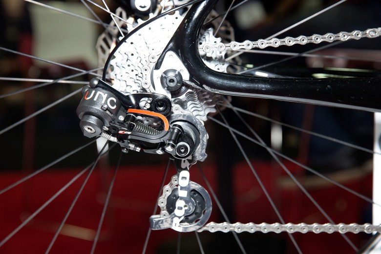 With all the buzz buzzing around the SRAM booth over the company’s new electronic derailleur system, we would be remiss if we didn’t at least mention the new Rotor Uno hydraulic drivetrain. Rotor has been making beautiful cranks, power-meter systems and ovalized chainrings, but has been being pushed out of the pro peleton by the bigger drivetrain players. So the Spanish component maker decided to launch its own drivetrain and sponsor a pro team (specifically MTN-Qhubeka) for 2016.