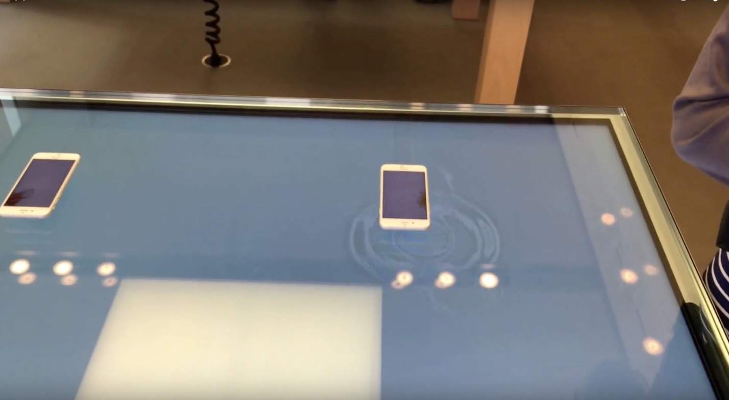 As you can see above, whenever a Apple specialist or customer taps on or swipes across the iPhone 6s devices on the table, a ripple effect appears on the surface. It’s hard to tell whether the table would ripple if you just touched it, rather than the iPhone, but it’s pretty cool looking nonetheless.
