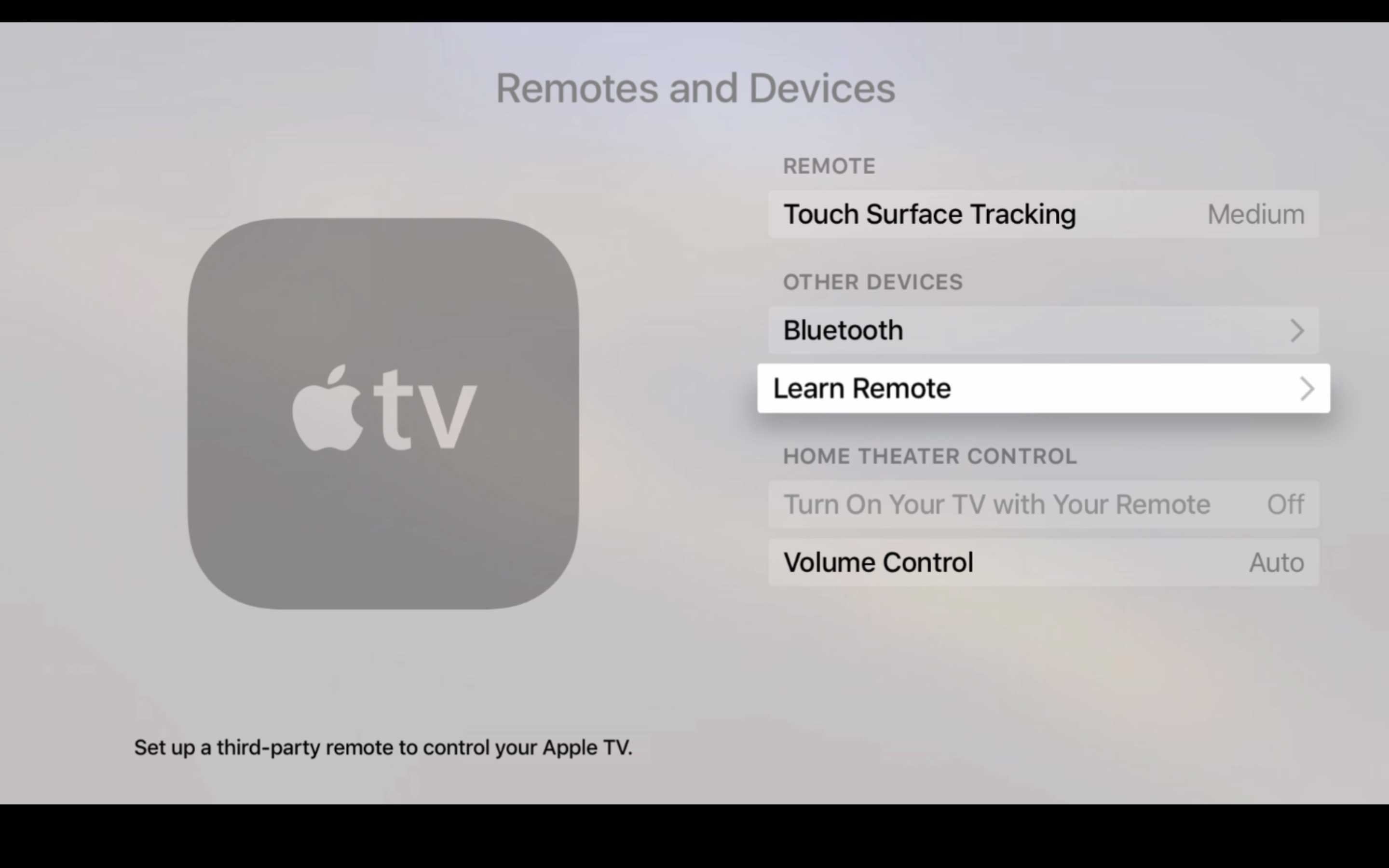 Using the new Apple TV Remote (before you lose it!), swipe over to Settings and click on it. Navigate to Remotes and Devices, then Learn Remote. Click on it.