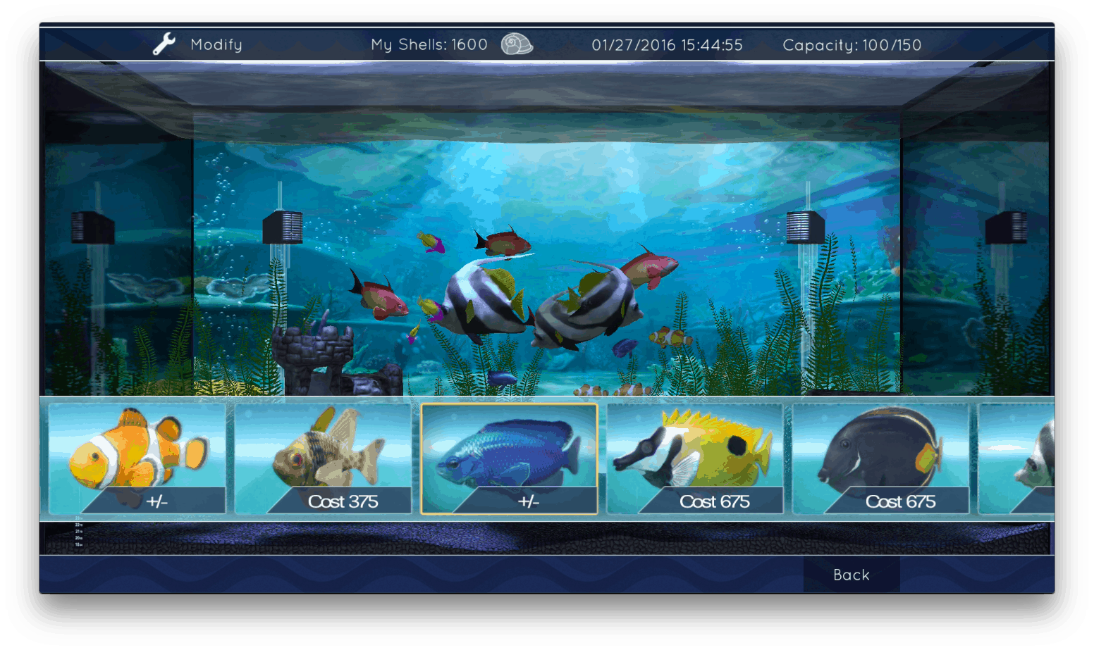 Next, onto the fish. The app includes ten different types of fish each with their own cost. Some less expensive while the most expensive fish are 675 shells. Once you buy a fish you can choose how many you want in the tank. Adding more fish costs more shells. And don’t forget, you can only add as many as the capacity of your tank allows. I added about 20 fish to my tank before it started to get a little overly crowded.