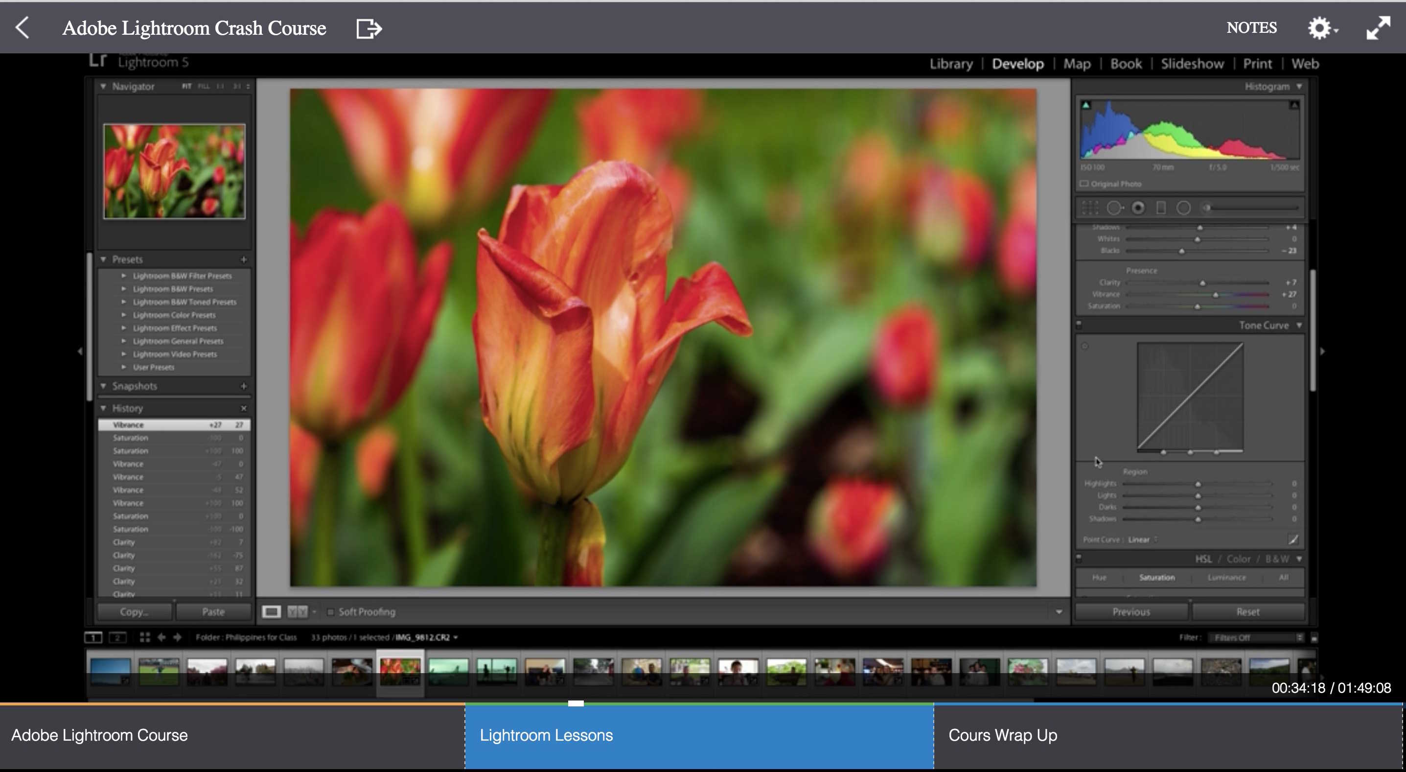 Even if the “teacher” is a college kid with bad diction, the one-hour Lightroom Basics course that I just took is pretty darn fantastic.
