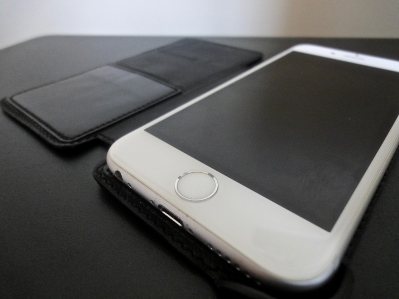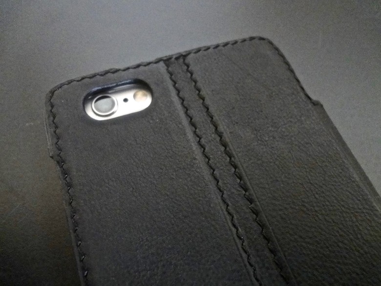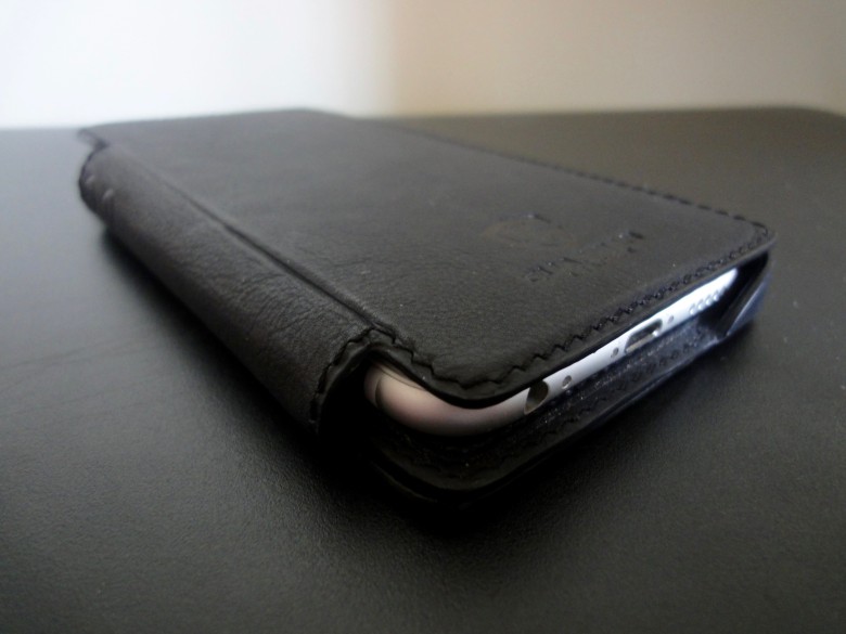 I love the look and especially the smell of the leather. It feels authentic though there’s obviously something inserted in between the stitching for the front and back to stiffen up the case a bit. One part that remains flimsy on purpose is the side so it can fold over. Built in are also covers for the volume up and down buttons, but they don’t work very well. This part of the case doesn’t press against the iPhone enough to properly align, but that’s on purpose.