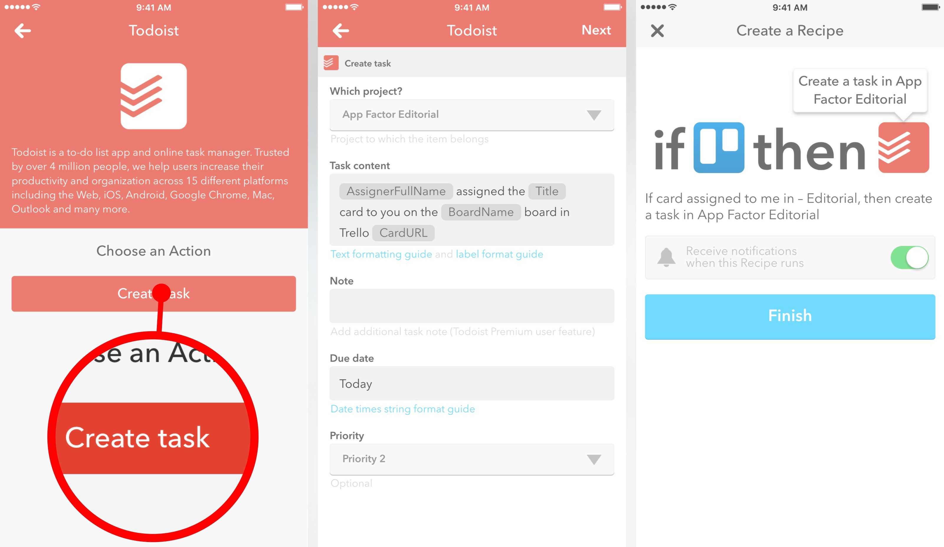 In my case, I wanted any Trello card assigned to me to appear in Todoist as a task, labeled with a specific priority (I don’t typically use priority when manually inputting tasks in Todoist, so using one in IFTTT allows me to easily pick out imported Trello cards in my task list).