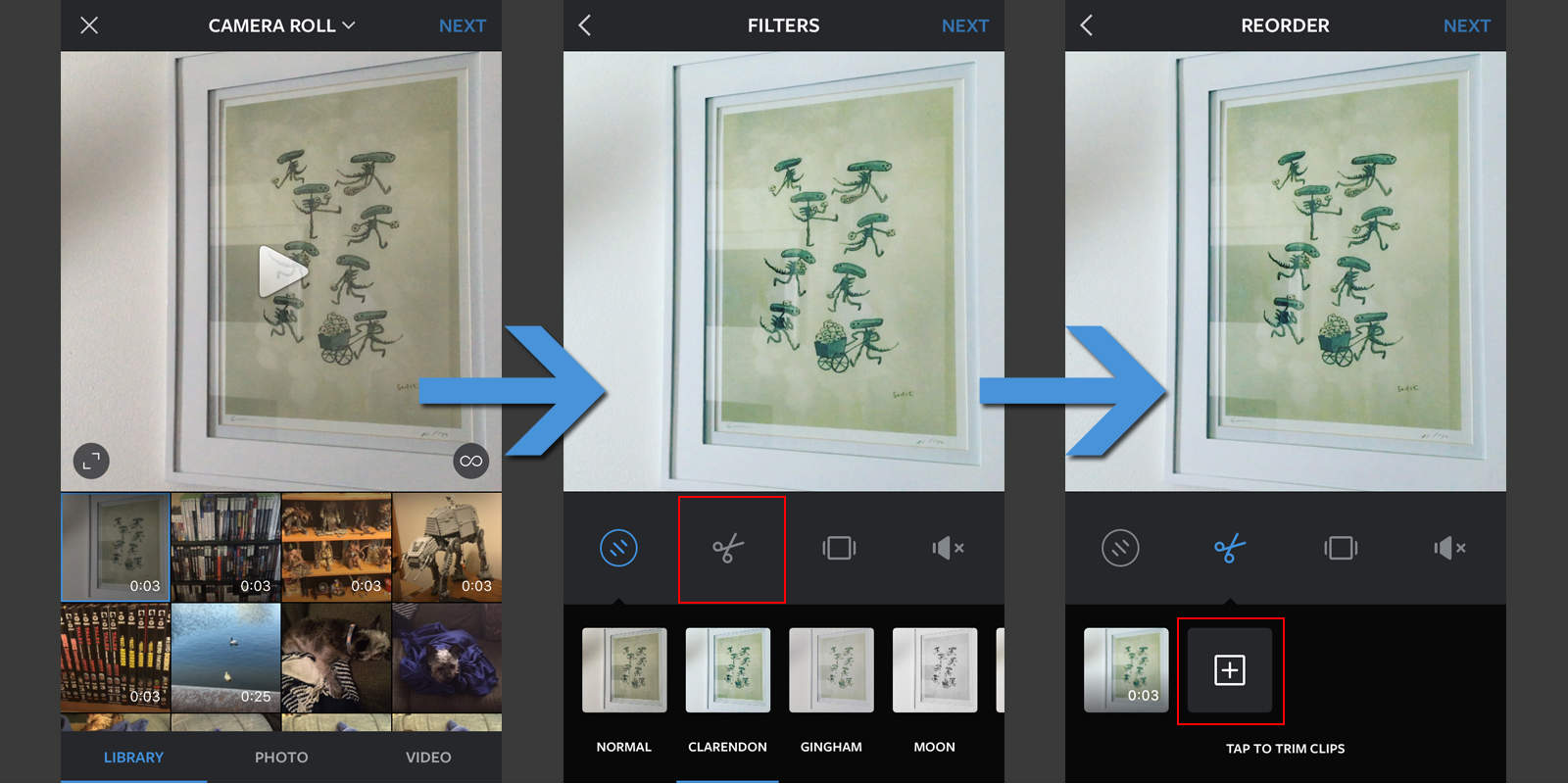 Once you’ve chosen a clip, you can pick a filter on the next screen. Any one you pick will apply to every video you put in there, so select well. When that’s done, you’ll need to tap the scissors icon to go to the Reorder screen.