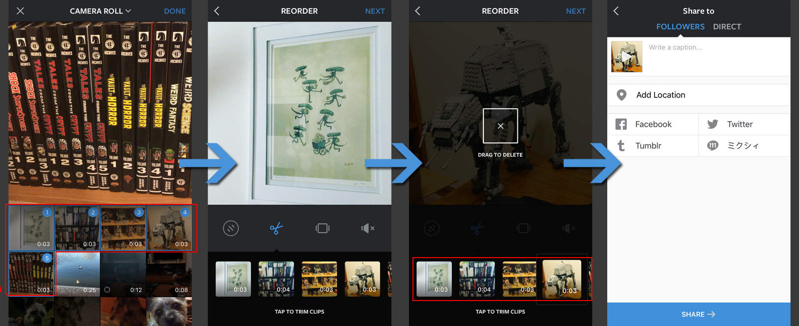 Once everything’s in there, you’ll go back to the Reorder screen, where you can adjust your clips. At this point, Instagram has already trimmed everything (evenly) to fit into 15 seconds, so if you want individual pieces to run longer or shorter or choose different starting points, just tap on them and drag the sliders around until it’s just the way you like it.