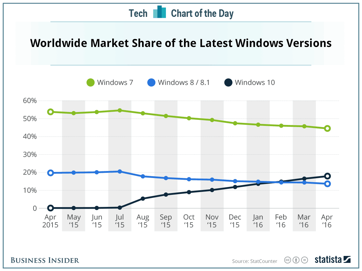 Killian forgot to mention that 1) W10 adoption rate has been faster than W7 by a big margin, in fact it is record breaking as far as Windows is concerned, 2) a big part of the reason why W7 (not WXP as you mentioned on your article) is still hovering around 40% is because a vast majority of them are enterprise/business PCs.