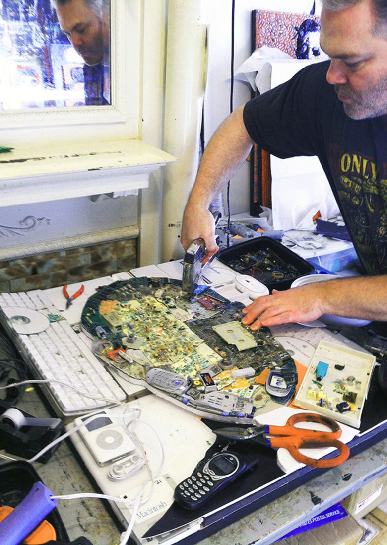 Lots of broken circuit boards and other electronics fragments add color, shape and familiarity to the face. The jawline was shaped with broken bits of iPhone. The final piece measured 3-feet by 4-feet.