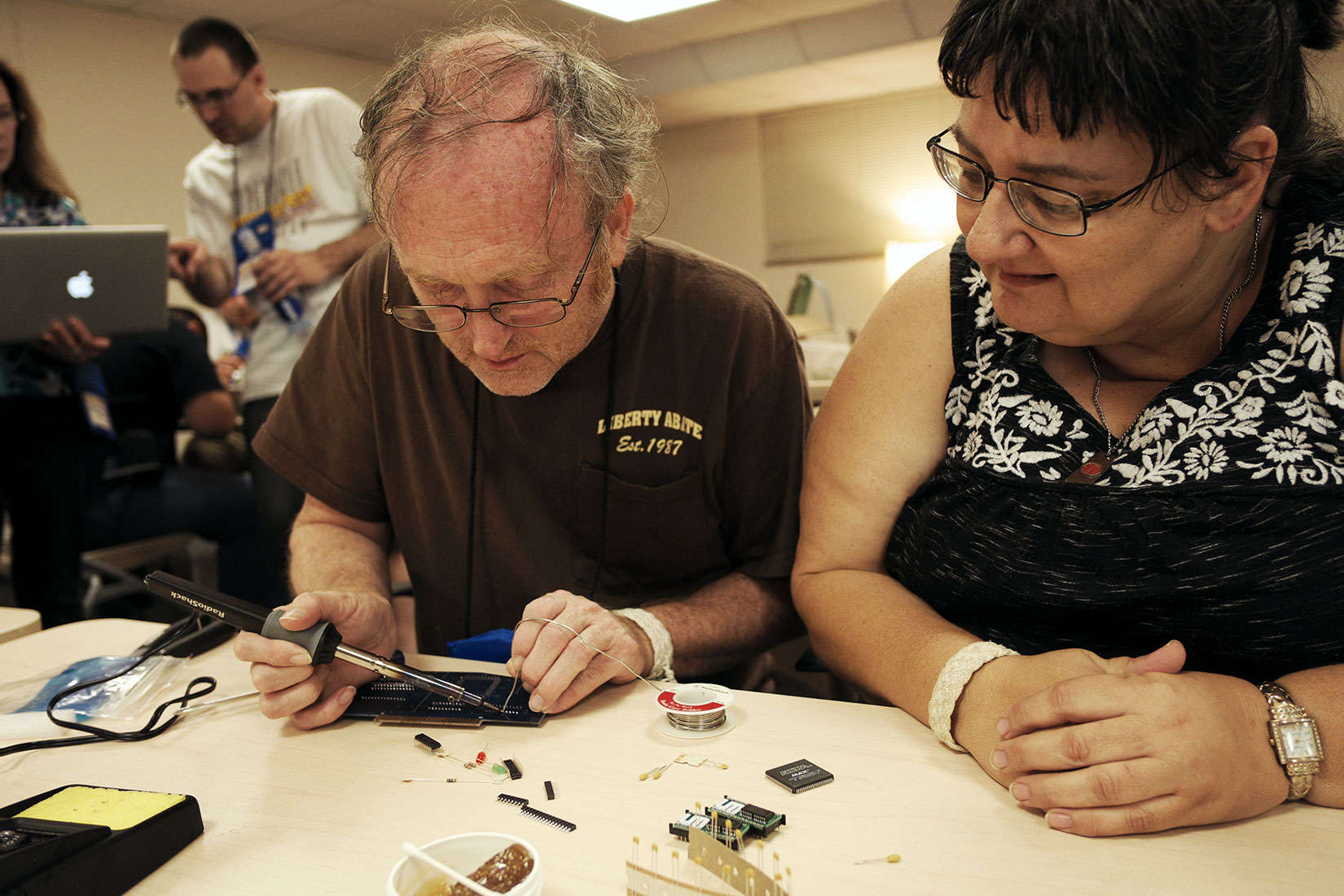 Across the room, John Lane, of Sullivan, Ill., slowly melted beads of solder onto a RAM card. He expressed little confidence in his ability to soldering, but his wife, Rachele, sat at his side and assured him his work looked good.