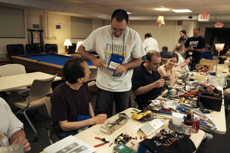 Martino and his colleague, Henry Courbis, of Spring Hill, Fla., tended to their students, hunkered in a dormitory basement at Rockhurst University. Some were soldering for the first time, while others used the session to work on recently acquired machines.