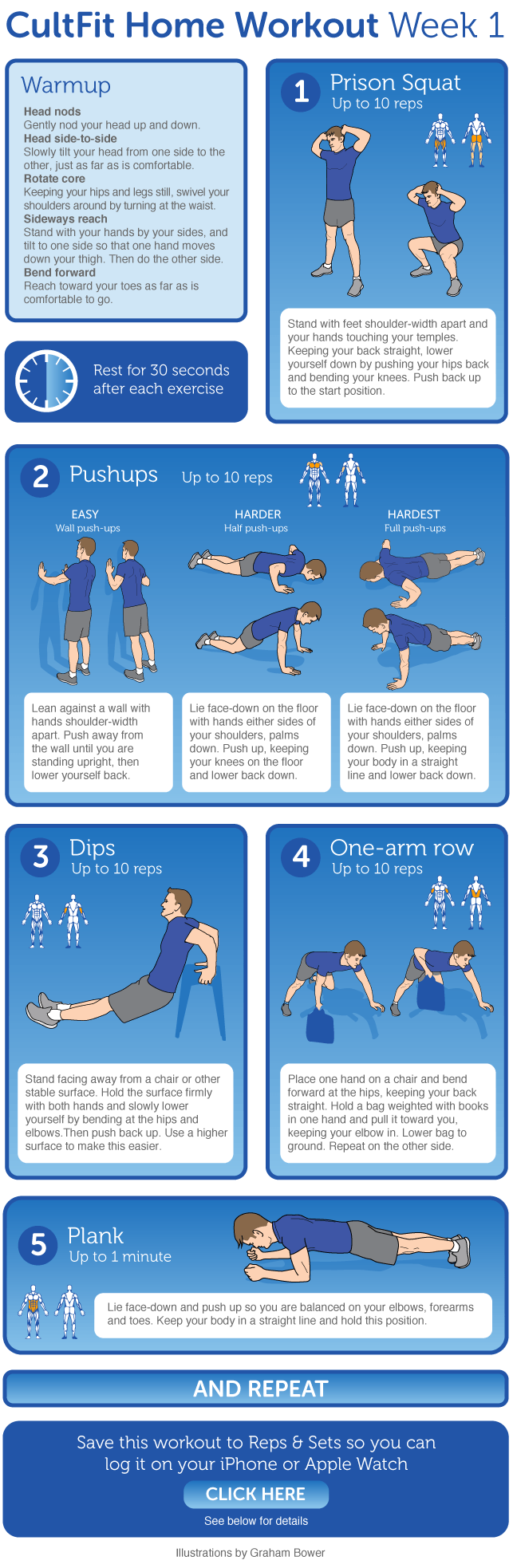 Want a hard copy of the exercise diagrams? Download the CultFit Home Workout Week 1 program in printable PDF format.