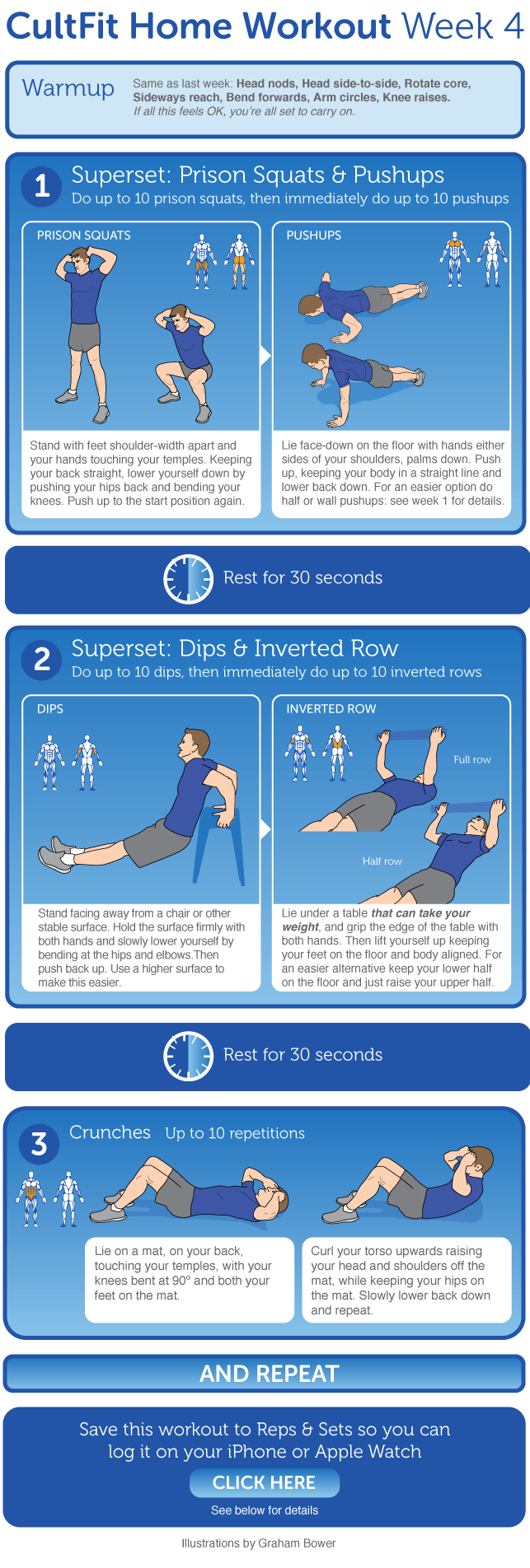 Want a hard copy of the exercise diagrams? Download the CultFit Home Workout Week 4 program in printable PDF format.