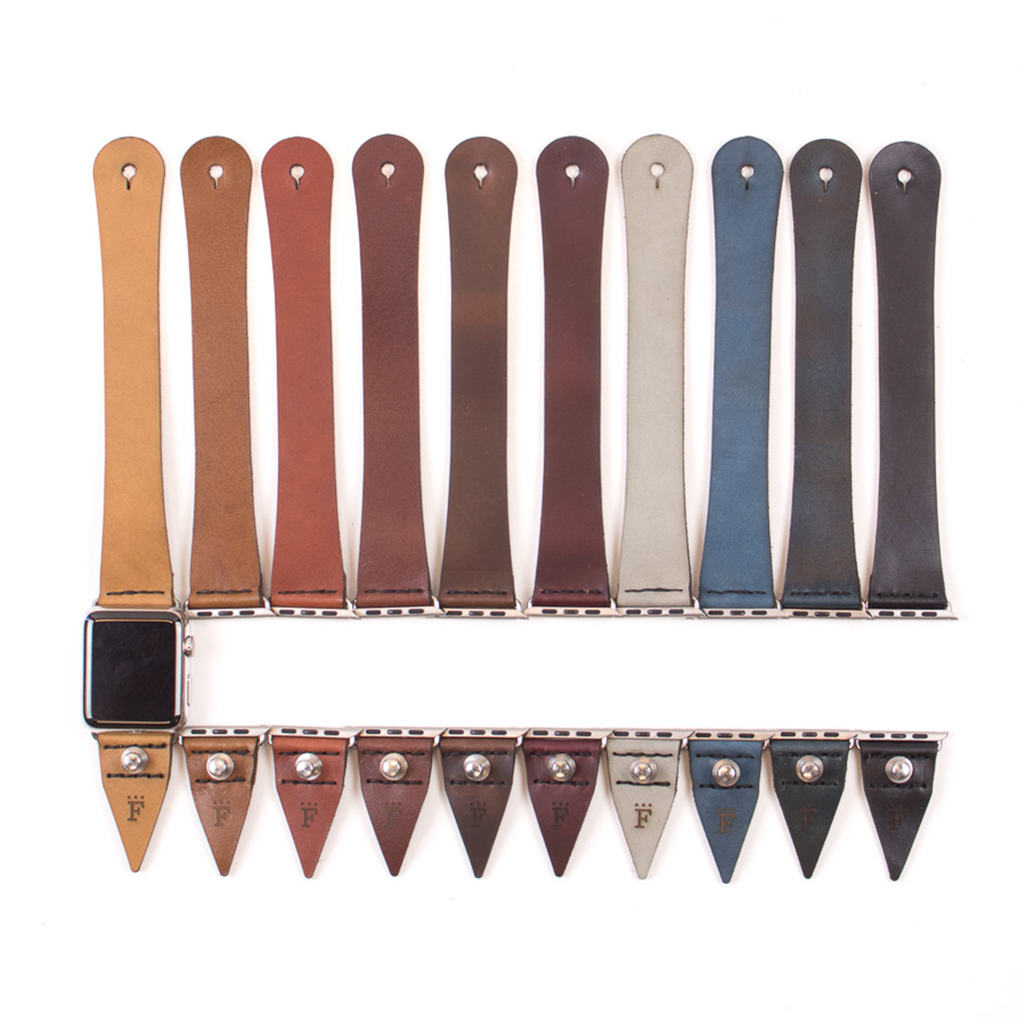 Each strap is laser-cut, hand-burnished and stitched from fine leather sourced from the 100-year-old Horween Leather Company in Chicago. Click-in adapters in stainless, silver, space gray and space black are sewn into the two-piece strap. The button-stud closure is either stainless or black stainless, depending on which adapter color is chosen.