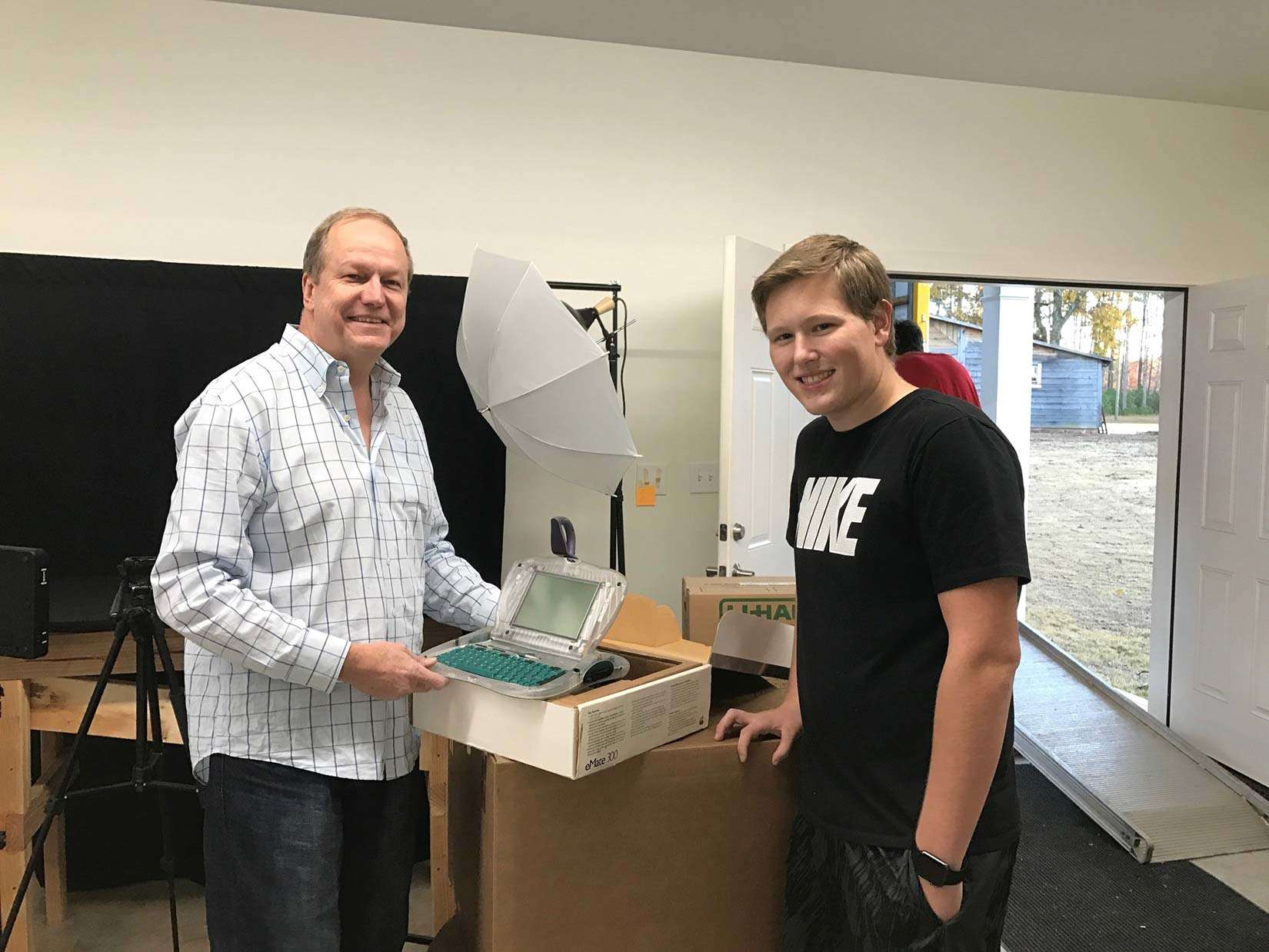 Vintage tech collectors Lonnie Mimms, left, and Alex Jason pose with an Apple e-Mate prototype, part of a collection Alex sold to Mimms.