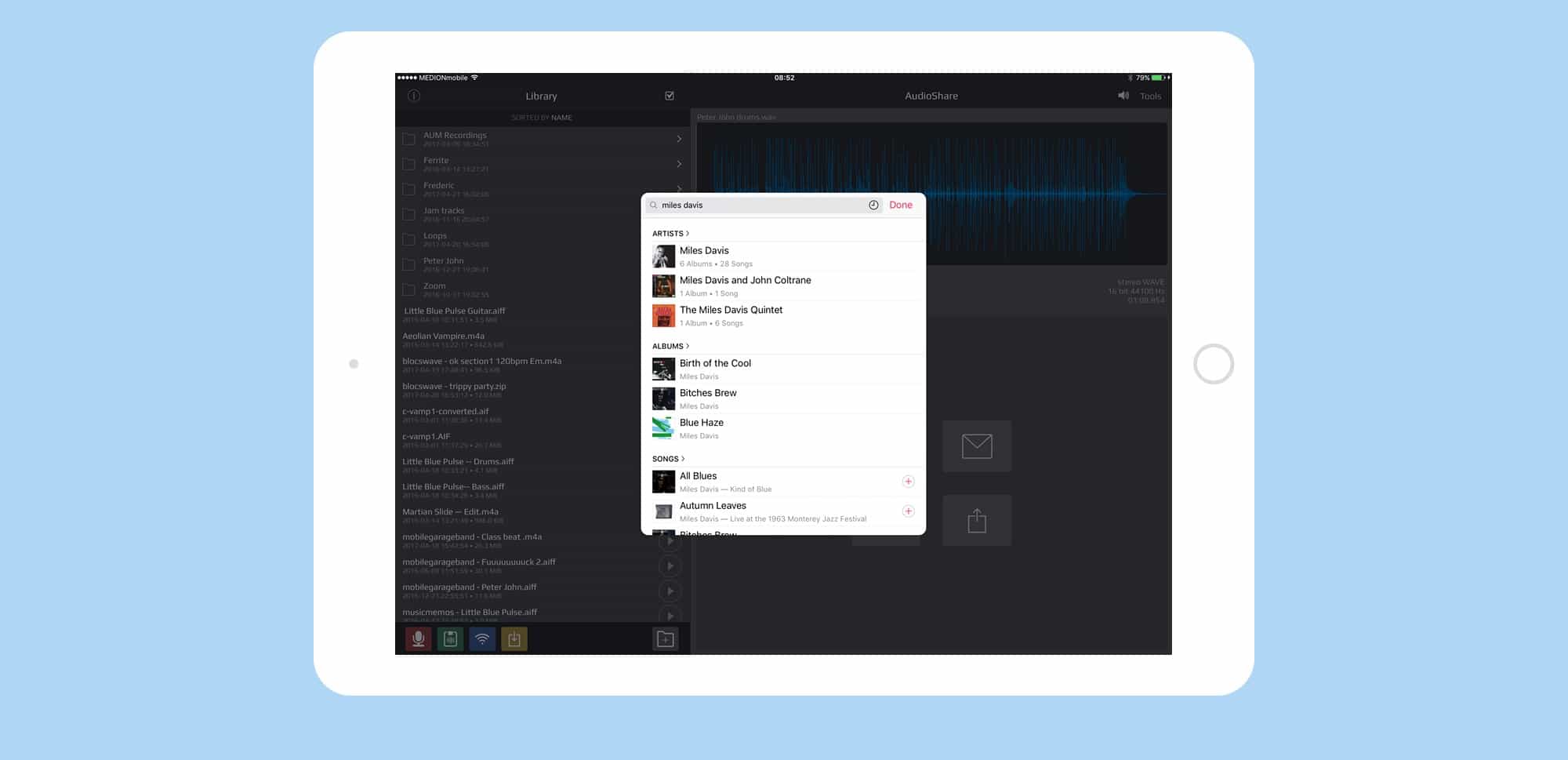 AudioShare is a great hub for audio found elsewhere. Not only can you Open in… pretty much any audio file from another app and store them in AudioShare, you can also import files from the iOS clipboard, from Dropbox and iCloud Drive, from any other app that supports there standards iOS document picker, and — this one may be huge — your iOS Music library (for files which you’ve added yourself). AudioShare can even start up a web server to transfer files directly from computers on your local network, via their browsers. And once you have grabbed that file, you can do anything.
