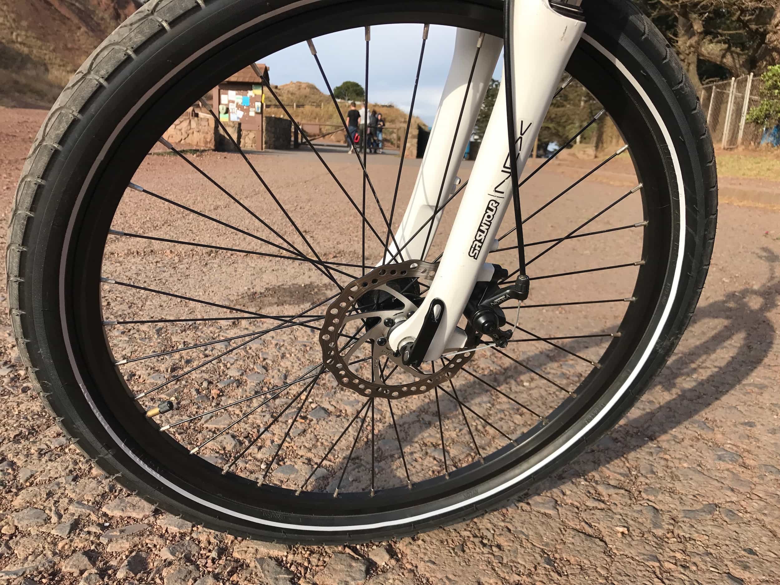 Espin bikes aren’t as slick as higher-end bikes. The components are entry-level, like the SunTour front suspension fork or the Tektro Novela mechanical disk brakes. Pricier bikes feature hydraulic brakes, which stop harder and are better modulated, but the Novela brakes are adequate and do the job.