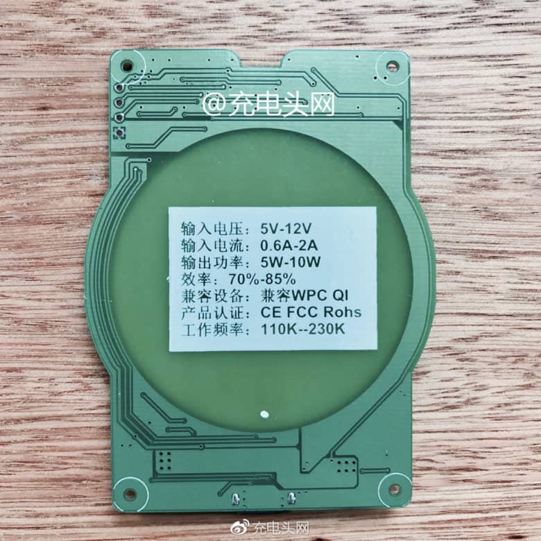 Alongside the coil, we see what appears to be a Lightning connector. The labels on the top and bottom of the circuit board have been blurred, but one clearly reads “iPhone.” On the back, there’s a sticker that reads “Qi,” the most popular wireless charging standard.