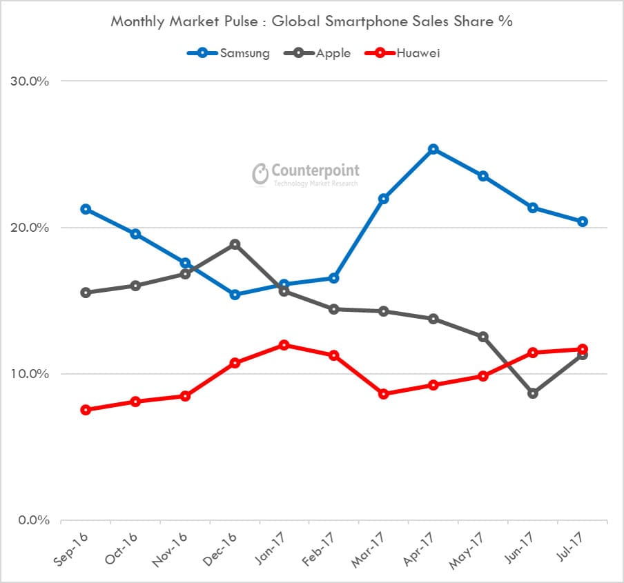 New research data from analytics firm Counterpoint shows that Chinese smartphone company Huawei consistently surpassed Apple in smartphone sales during June and July to take over the No. 2 spot. Samsung remains at the top of the heap.