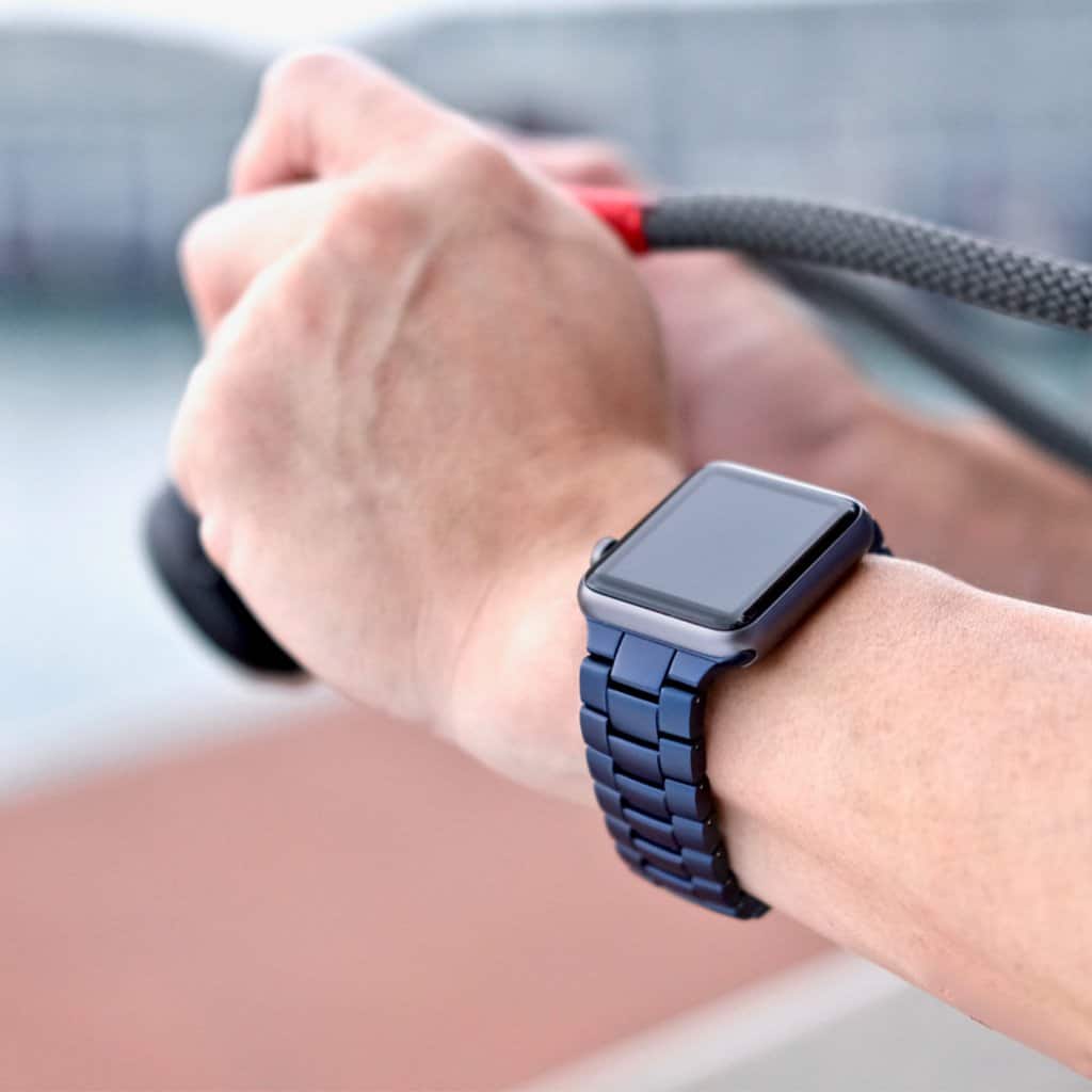 Like its Juuk predecessors, the Velo band for Apple Watch is made of 6000 series hard-anodized aluminum. As they did with the sporty Vitero, Juuk reengineered the link profile for the Velo by adding a subtle taper. The result is a beautifully smooth curvature around the wrist that a flat link simply cannot achieve — most brands don’t bother doing this, and the majority of three-row bracelets are usually just flat links.
