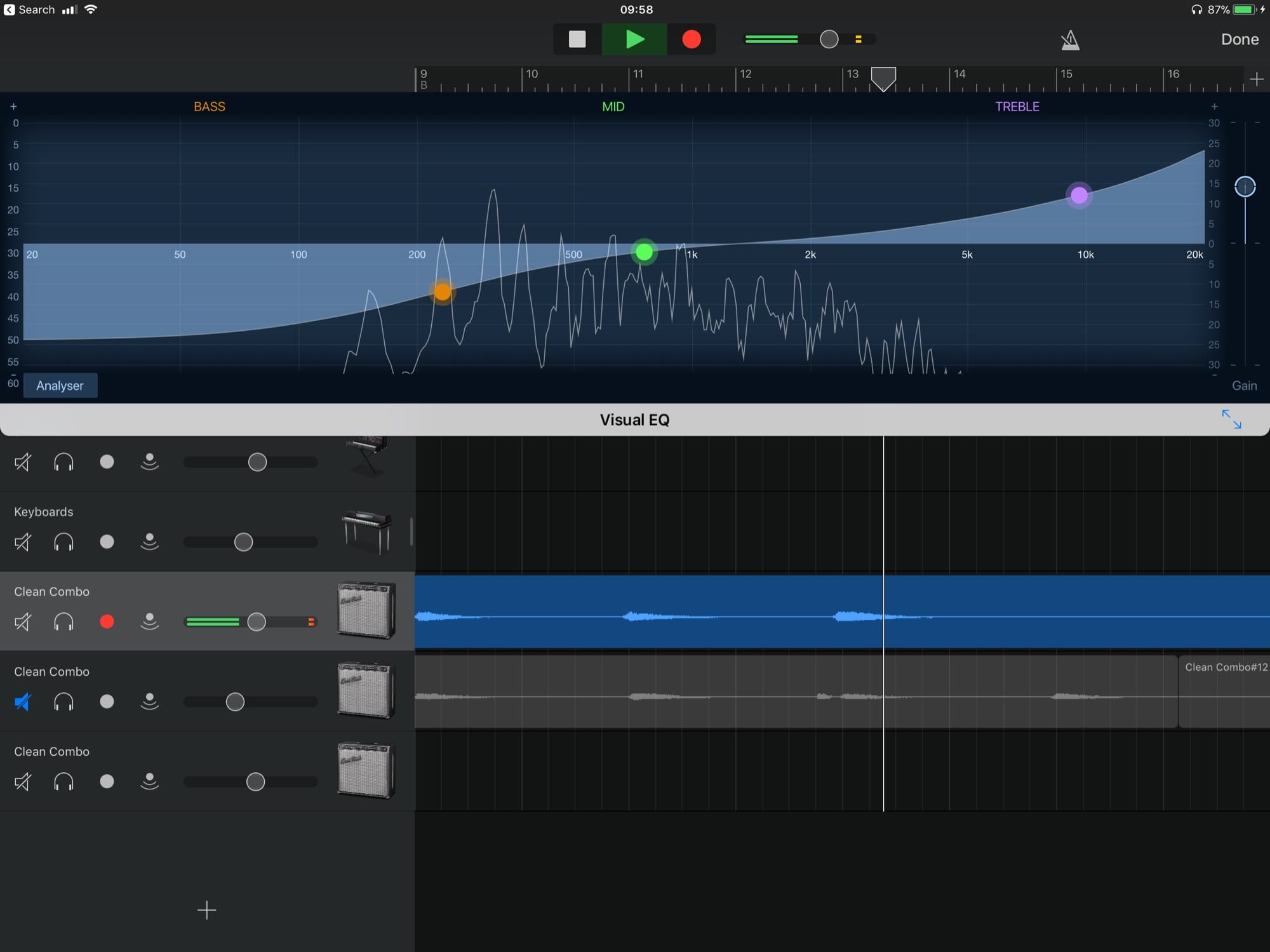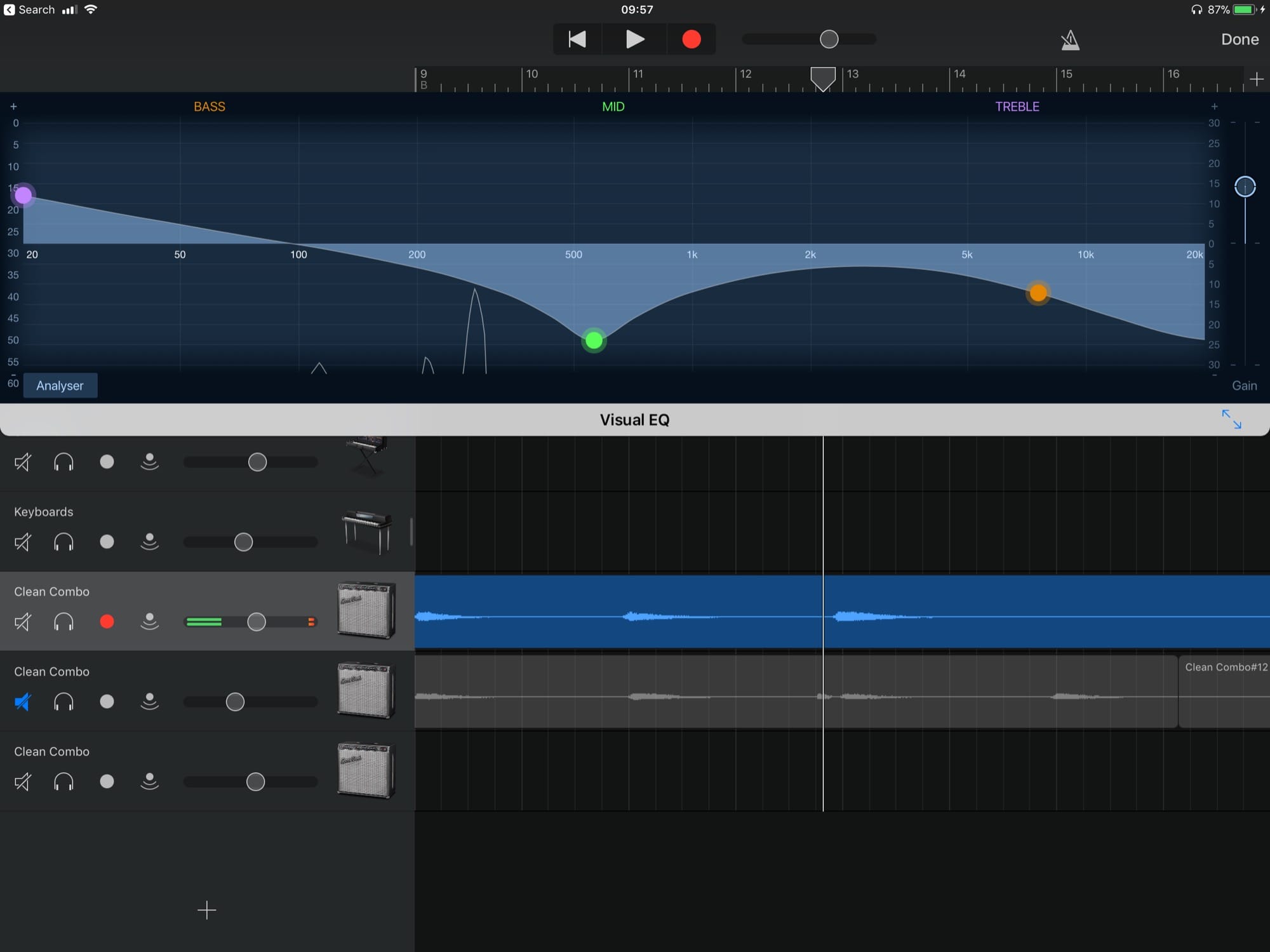 One great recent addition to GarageBand for iOS is the Visual EQ, an equalizer that is about as far away from the 1980s-style bank of sliders as it’s possible to get. The Visual EQ also shows you a waveform of the actual sound you’re adjusting, so you can see as well as hear the effects immediately. This visual element, combined with a clever three-“band” EQ, makes this a very powerful tool for shaping your music.