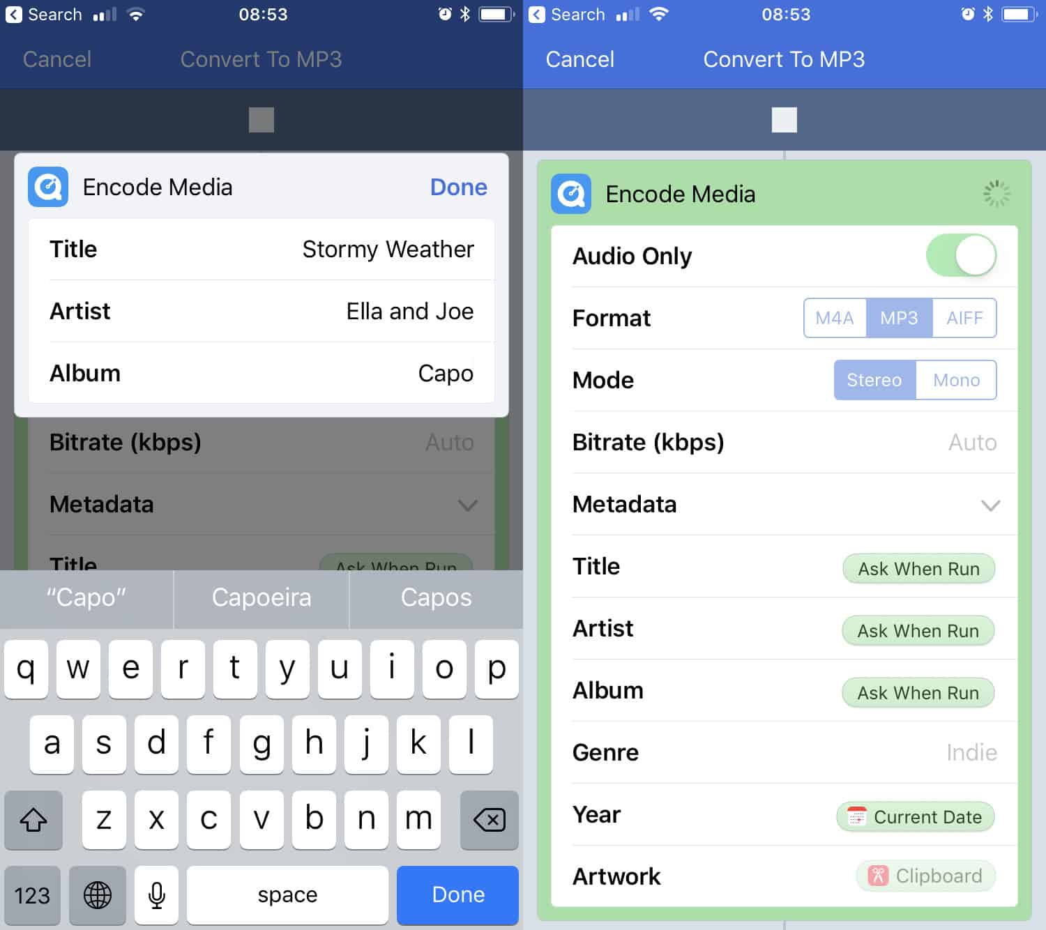 Once you’ve got the workflow set up, to convert an audio track or video to MP3, you simply share it and pick the workflow you just created. Depending on how you set up the workflow, you may be asked to fill out some of fields along the way (name, album and so on), and you may have to choose a folder save it in. Other than that, the conversion runs unsupervised.