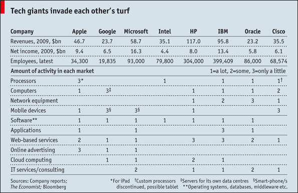 Check out this fascinating chart from The Economist regarding IT industry revenues, profits, employees and so on. The two monsters of the space are HP and IBM, which both have double the revenues of Apple, and more than 10x the number of employees.