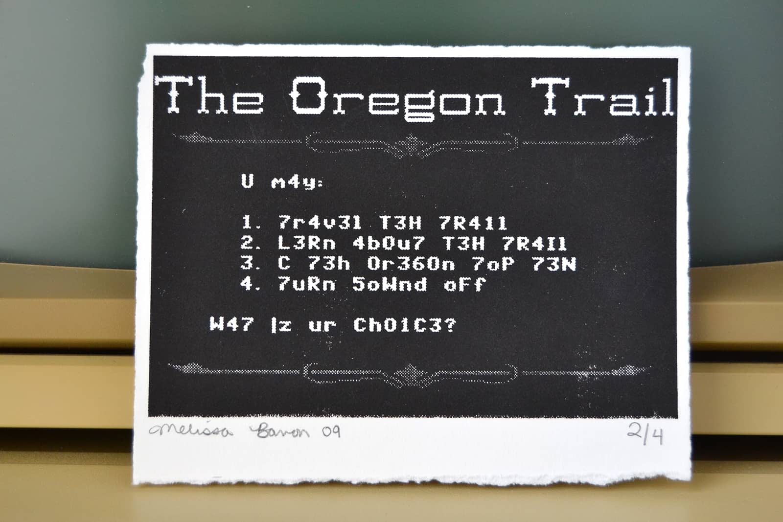 As she began to play the games, she opened the disk images in a text editor and wondered what would happen if she changed the characters. Her first project involved The Oregon Trail because it was the first game she played as a kid.