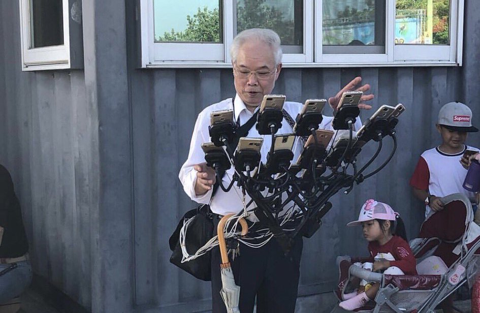 San-yuan currently uses 11 phones but he adds new devices to his setup constantly. He told local news that he spends $1,290 a month adding new phones to his rig, purchasing lures for pokestops and other in-app upgrades. It hard to tell which phones he uses, but it doesn’t look like they’re iPhones because there’s a headphone jack on top of most of them or a non-Apple camera array.
