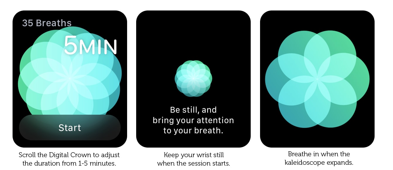 Apple presents a beautiful green kaleidoscope effect as a visual indicator to show you when to breathe. It looks a bit like the petals of a lotus flower opening and closing.