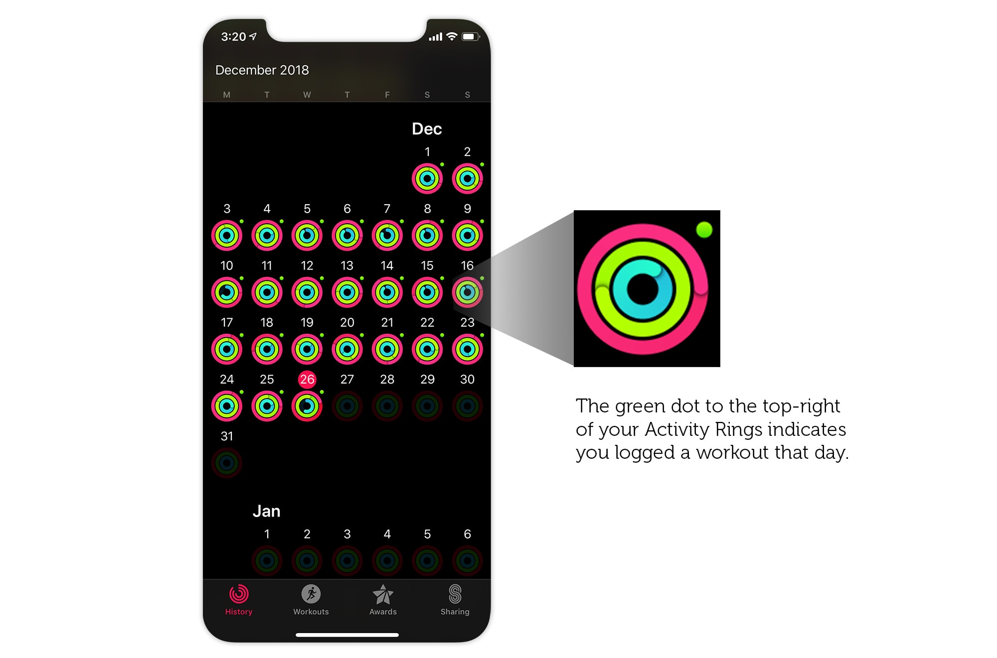In the Activity app, every day that you log a workout you get a green dot next to your activity rings. It’s a great visual indicator of your streak building up over time. Right there is your motivation: those tiny green dots.