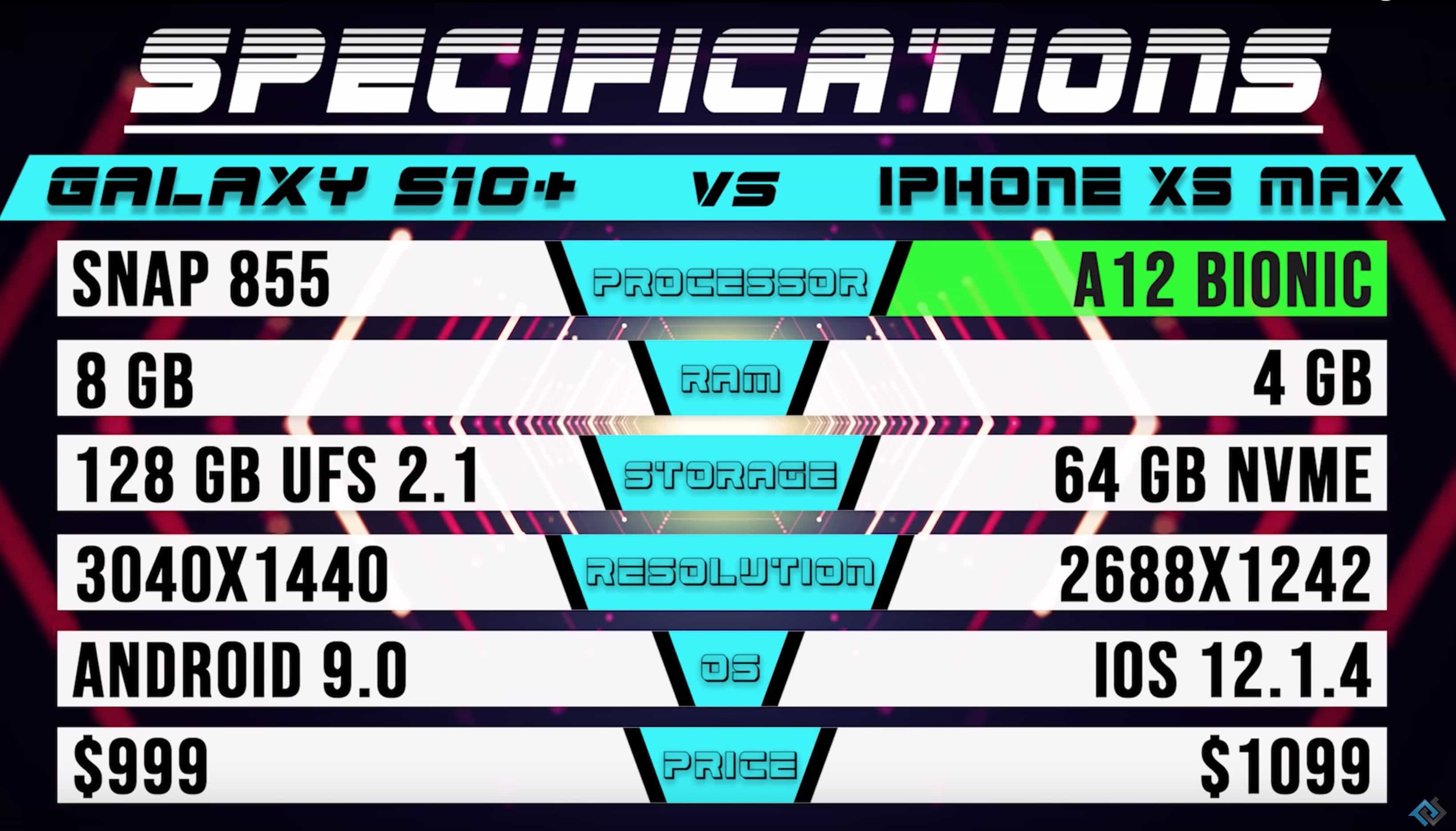 The Galaxy S10+ has 8GB of RAM compared to the 4GB of RAM on the XS Max. The lack of RAM didn’t hurt the iPhone XS Max in its battle with the regular S10 that packs 8GB of RAM. The S10+ has a faster e Galaxy S10+ Snapdragon 855 processor than the regular S10 though and that appears to have made all the difference.