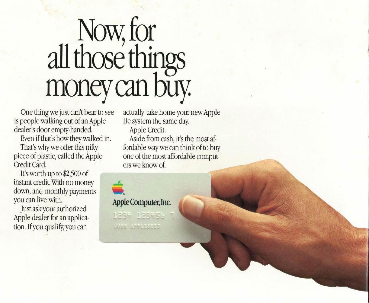 Applications were available at authorized Apple dealers. The consumer card said, “If you qualify you can actually take home your new Apple IIe system the same day. Apple Credit. Aside from cash, it’s the most affordable way we can think of to buy one of the themes affordable computers we know of.”