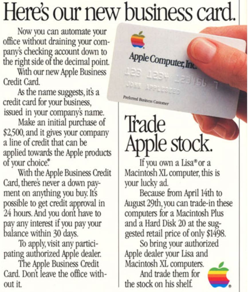 Computer magazines ran adds for an Apple Business Credit Card and a consumer credit card, each initially worth $2,500 in instant credit.