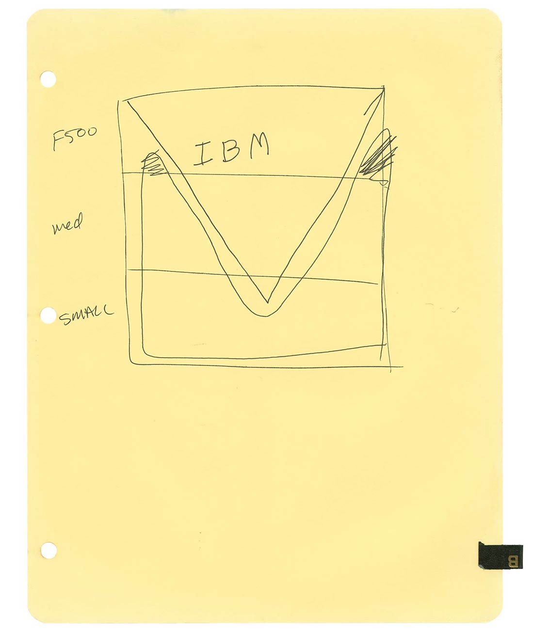This sketch is from 1985 and invites multiple interpretations. “F500” might refer to a 1985 model of a Sony computer. Was Jobs imagining smaller computers than those already on the market, or monitors of decreasing sizes? Perhaps he was dismissing IBM or hinting at a collaboration with them, which did eventually happen. The sketch may also be a reminder to push the IBM envelope, and achieve another level of computing, or to change the nature of the envelope altogether.