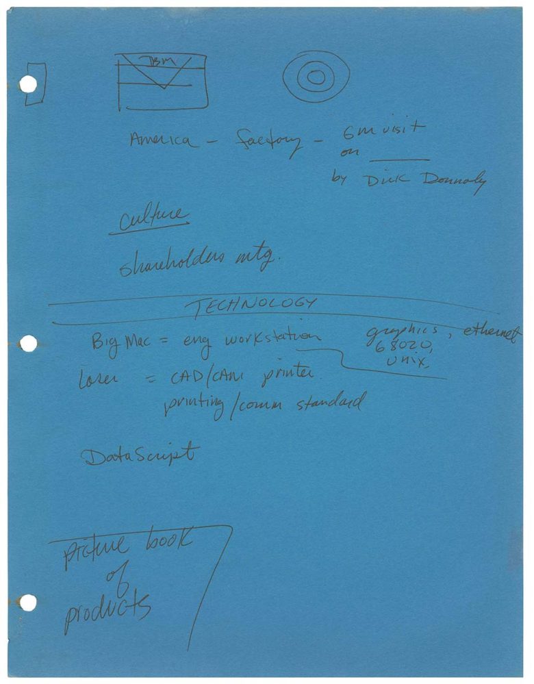 Interpreting someone’s notes always involves guesswork, but in the case of Steve Jobs, it’s all the more enigmatic. This blue sheet appears also to have been written in 1985, when Jobs was establishing NeXT, during a very preliminary meeting about the company. By dividing