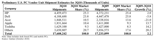 STAMFORD, Conn., October 13, 2010 — Worldwide PC shipments surpassed 88.3 million units in the third quarter of 2010, a 7.6 percent increase from the third quarter of 2009, according to preliminary results by Gartner, Inc. These third quarter results were below Gartner’s earlier market outlook. Gartner had expected third quarter PC shipments to grow 12.7 percent.