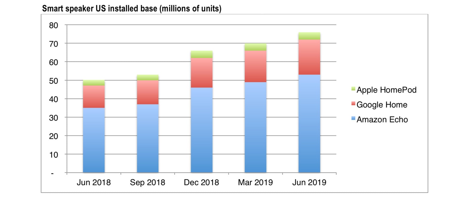 There were 76 million smart speakers in American homes and offices during the second quarter of this year, reports Consumer Intelligence Research Partners (CIRP).