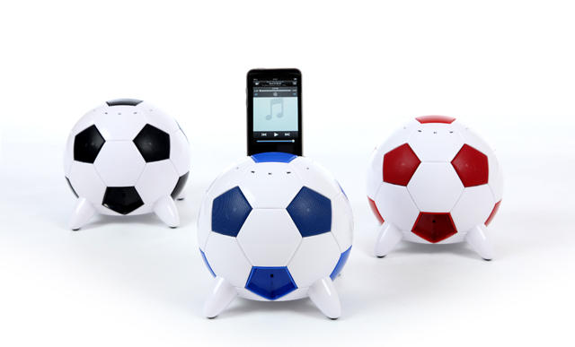 MiSoccer is both a speaker and a docking station for the iPod, and comes with a handy remote. Its three speakers are positioned for maximum sound distribution.